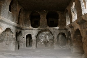 The nearby volcano formed the area of Cappadocia; many moons ago the volcano in Mount Hassan erupted and filled the valley with volcanic material. Over the course of many years the earthquakes in the area combined with natural erosion left the area dotted with Pashaba’s or fairy chimneys. The second day I had a tour, we went to another part of Goerme and the Open Air Museum. Basically there were a bunch of caves carved into various chimneys; many of which were used for monasteries, churches and other religious uses.  The guide told us about what rooms were used for, but I think it’s all hearsay – how do they really know what the rooms were used for, it’s not like there is an ancient floor plan floating around town. Anyway, we were able to climb around to the different areas and check out frescos that were thousands of years old; the place was so peaceful and calm that I could have spent hours exploring.
