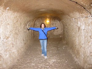 The first part of the third day was spent hiking through the Ihlara valley which is “composed of cracks and breakdowns which came into existence from the balsalt getting cold and the andesite intensity lava in the volcanic rock”.  The Melendis stream divided the mountain giving the canyon it’s appearance today. It was dotted with caves high above the hills – more shelters, churches and graves.  Some were accessible to reach but with the snow on the ground it made the climbs a bit treacherous. In the afternoon we went to the Derinkuyu underground city; the underground city is literally 8 floors below the ground. These caves where designed to protect the people during wars; they lived below ground for up to 9 months; considering they were “cave men” they had some seriously sophisticated ventilation and security systems. It was a maze of stairs, ramps and small crevasses but we managed to see a number of the rooms throughout the underground city and get a feel for how life might have been like as a cave man.