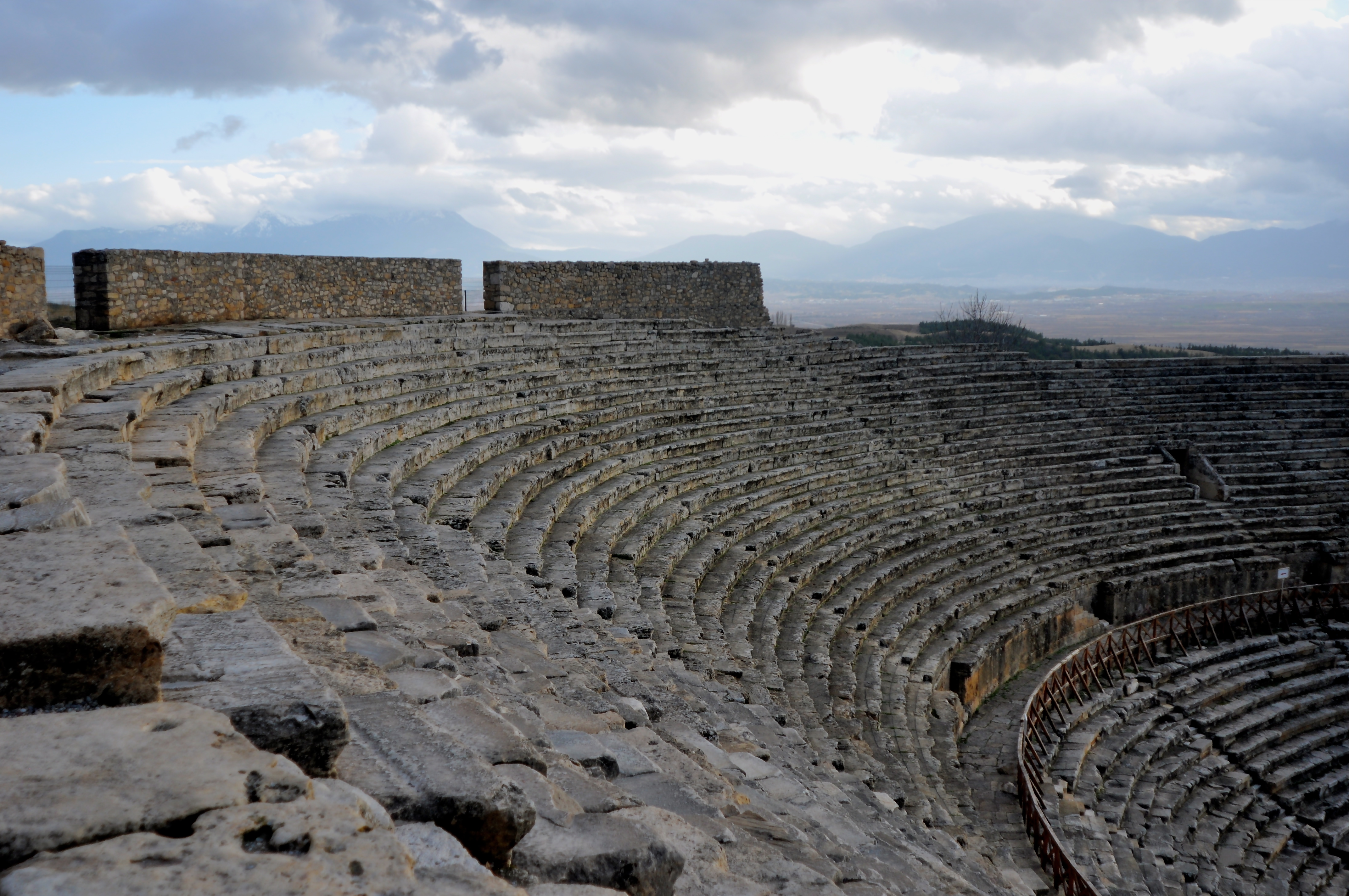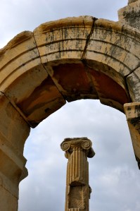 The slippery black algae had other plans for me and within an instant my shin smashed into the limestone, my free hand scraped the side of the ledge and my camera got an unexpected rinse in the crystal clear blue water. It happened so quickly, but I stealthfully pulled out my towel to dry the camera and at the same time removed the battery and the SD card. Needless to say my final dip in the deep end was over before it started. Apparently, the water was healing because both my feet felt a little better and I ran up the hill just in time to catch a glimpse of the theater. The sun was fighting the dark clouds to shine through as I slipped back into the bus unscathed with all my limbs and camera attached.