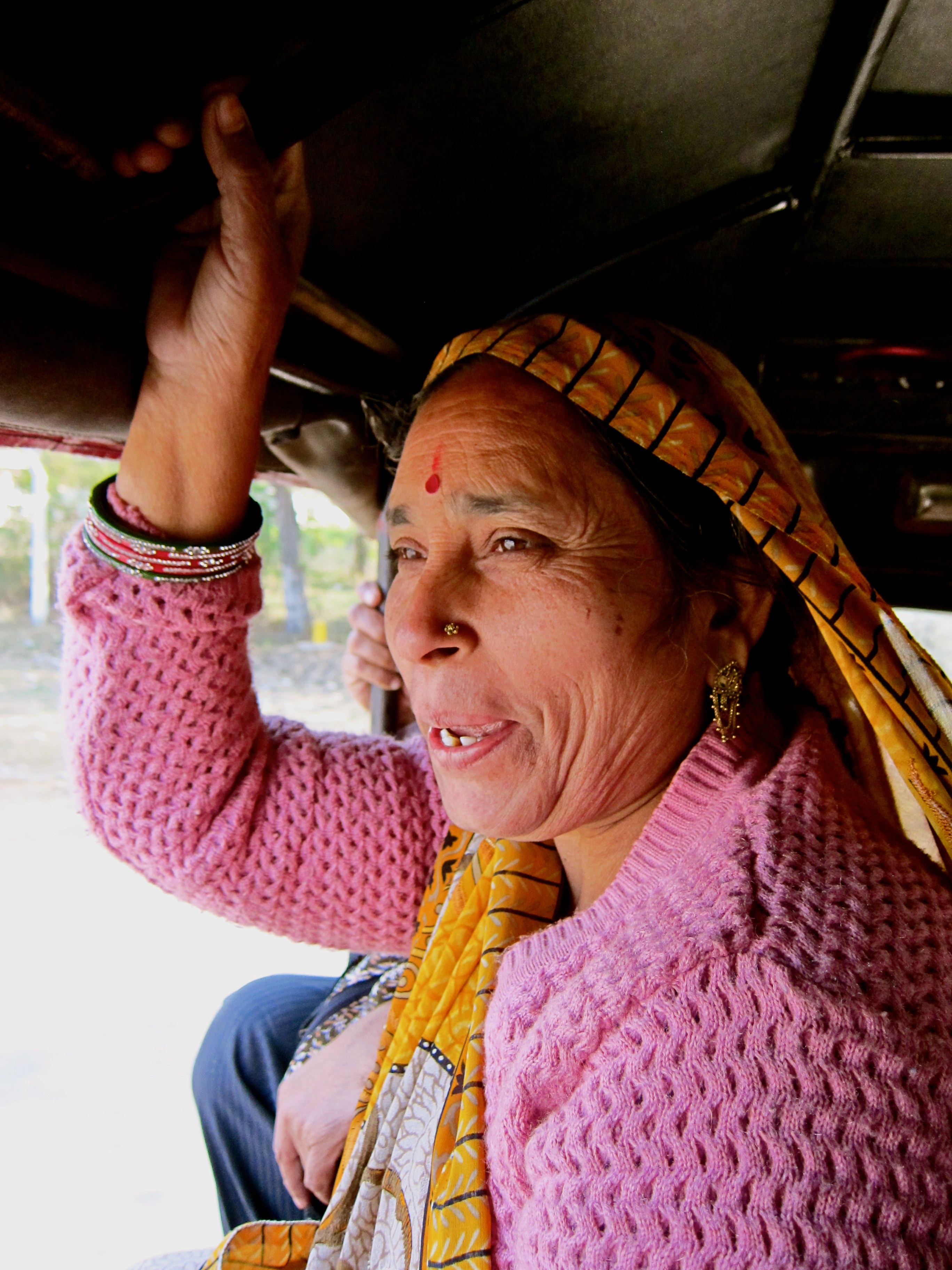 sitting next to me as she grabbed the frame above her head and used her other hand to hold her sari to her face. The first 30 minutes were amusing as I watched out the back, wide-eyed and proud of myself for going local. We passed horse drawn carts and men on bicycles carrying loads 5 times larger than their bike. The motorcycles driven by men in turbans with dark aviator glasses as well as trucks belching black exhaust fumes whizzed by us like we were the cow chewing on grass. The crowded city became small villages with woman selling oranges on the side of road, then quickly the villages became fields and eventually we were in the countryside.